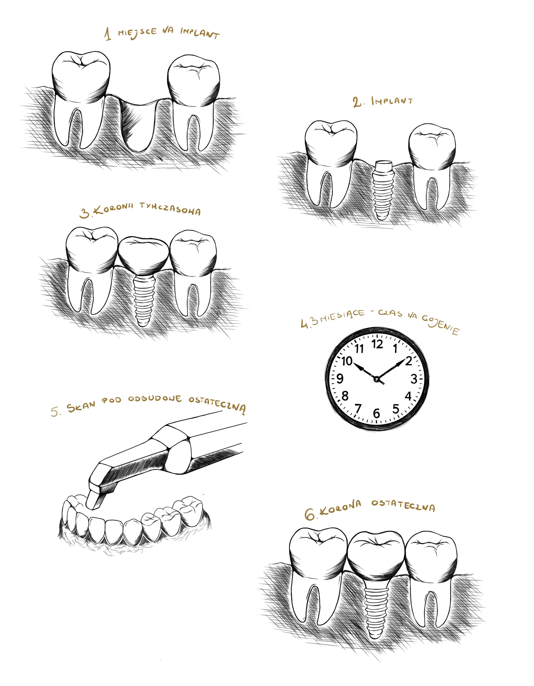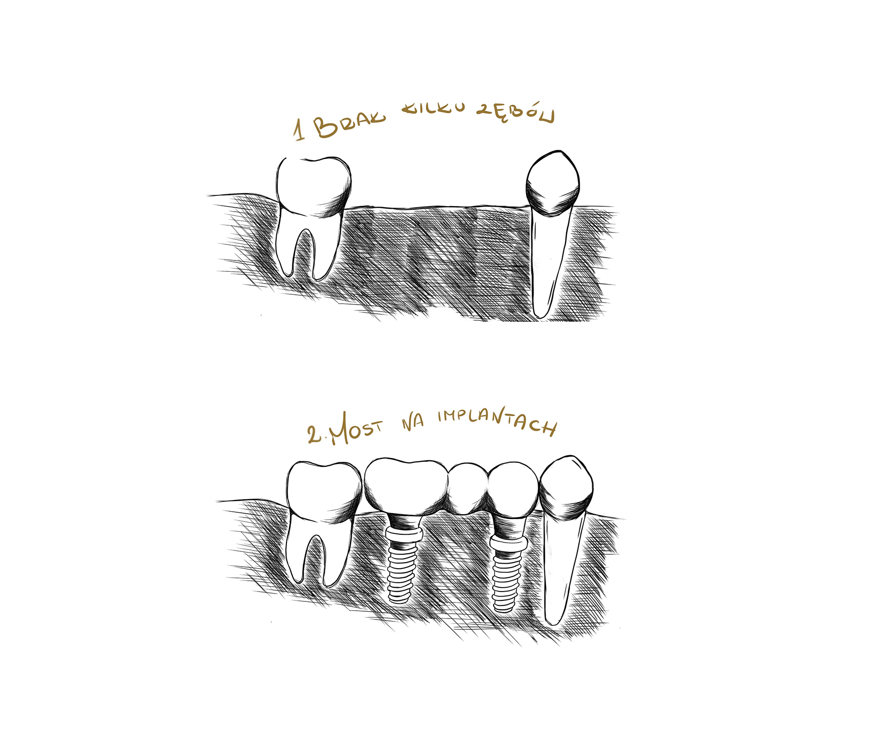 Braki 2 czy 3 zębów można uzupełnić pojedynczymi koronami na implantach lub mostami opartymi na implantach. Efektem jest komfort użytkowania i trwałość porównywalna z naturalnym uzębieniem — bez podrażnień, klejów, dyskomfortu i problemów typowych dla protez ruchomych.